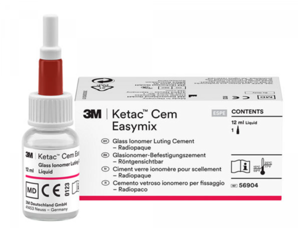 KETAC CEM EASYMIX - 3M Espe Cemento radiopaco per il fissaggio defin itivo, a base vetroionomerica. Grazie al l'estrema finezza della polvere (solo 17 micron) è facilmente miscelabile: carat terizzato da un'eccellente adesione e da una minima solubilità. Nuova formulazio ne per una miscelazione più semplice e r apida. Confezione ricambio di liquido da 12 ML + 1 contagocce