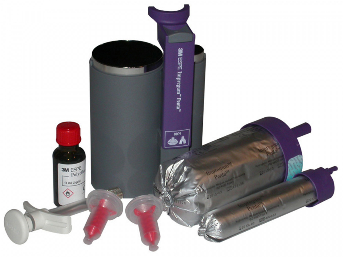 IMPREGUM PENTA Polietere, a media viscosità, per impronte di precisione in un un'unica fase. Versione per sistema Pentamix. Intro Kit per PENTAMIX 3: 1 massa base da 300 ml + 1 catalizzatore da 60 ml + 1 cartuccia Impregum Penta P3 + 10 cannule miscelatrici Penta + 1 siringa per elastomeri Penta + 1 flacone adesivo per polieteri da 17 ml