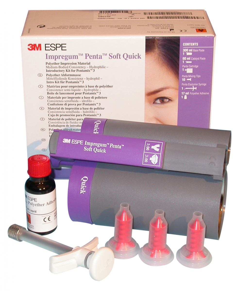 IMPREGUM PENTA SOFT QUICK Nuovo polietere ad indurimento rapido, per impronte di precisione in un'unica fase, in versione soft. Ideale per impronte per corone e ponti, per inlay e onlay, per impianti e per impronte di posizione. La precisione è garantita grazie alla migliore idrofilia iniziale e alle notevoli proprietà tissotropiche. Di facile rimozione, al fresco sapore di menta. Versione per sistema Pentamix. Intro Kit per PENTAMIX 3: 1 massa base da 300 ml + 1 catalizzatore da 60 ml + 1 cartuccia Impregum Penta Soft Quick P3 + 10 puntali miscelatori Penta + 1 siringa per elastomeri Penta + 1 flacone adesivo per polieteri da 17 ml