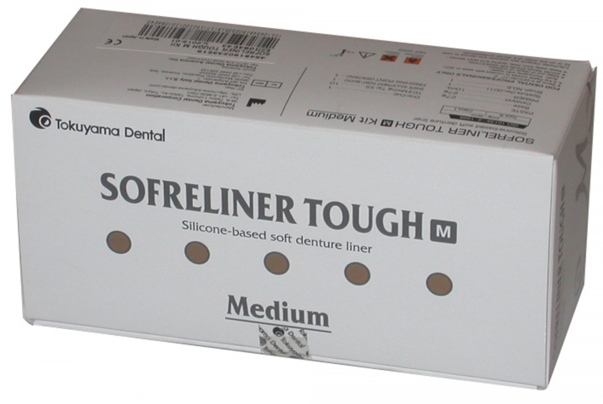 TOKUSO SOFRELINER TOUGH M Resina siliconica di tipo soft, per protesi parziali o totali, con tecnica diretta e indiretta; particolarmente indicata nei casi di riassorbimento alveolare, sottigliezza di cresta, decupito. Kit: 1 cartuccia da 54 gr + Primer Tough da 10 ml + 10 puntali gialli + accessori