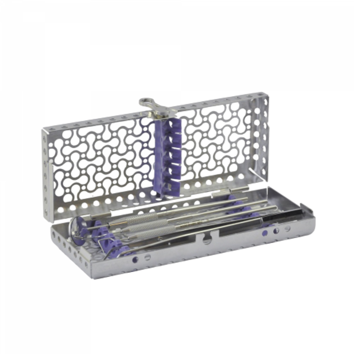 Ideale per l'uso con il termodisinfettore. Il sistema di chiusura è dotato di indicatore che permette di visualizzare se la cassetta è aperta o chiusa. Le innovative guide colorate in silicone consentono un maggiore flusso dell'acqua/ vapore e una migliore tenuta degli strumenti.