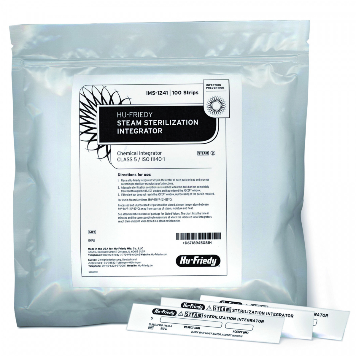 INDICATORI CHIMICI PER LA STERILIZZAZIONE Reagiscono alle tre variabili critiche: tempo di sterilizzazione, temperatura e presenza di vapore. Facilità di interpretazione grazie alla doppia finestra di lettura ("Accept" o "Reject"). Senza piombo e senza lattice. Confezione: 100 indicatori