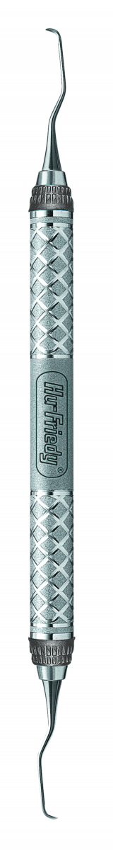 CURETTE GRACEY MINI-FIVE Facilita l'accesso a tasche gengivali profonde (più di 5 mm) grazie al gambo terminale allungato di 3 mm; anche l'accesso a ridotte superfici radicolari risulta facilitato grazie ad una punta più corta di quella della curette After-Five. L'effetto traumatico risulta ridotto, poichè la punta sottile permette di intervenire senza distendere il tessuto gengivale. Per anteriori. Manico nr.9, EverEdge Technology rotondo grigio, più grosso (Ø 9,5 mm).