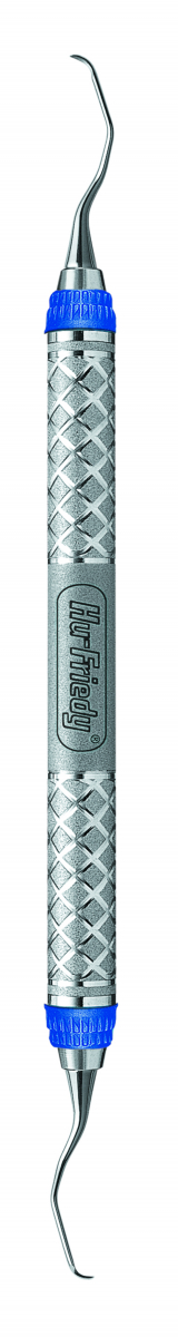 CURETTE GRACEY MINI-FIVE Facilita l'accesso a tasche gengivali profonde (più di 5 mm) grazie al gambo terminale allungato di 3 mm; anche l'accesso a ridotte superfici radicolari risulta facilitato grazie ad una punta più corta di quella della curette After-Five. L'effetto traumatico risulta ridotto, poichè la punta sottile permette di intervenire senza distendere il tessuto gengivale. Premolari e molari, distale. Manico nr.9, EverEdge Technology rotondo blu, più grosso (Ø 9,5 mm).