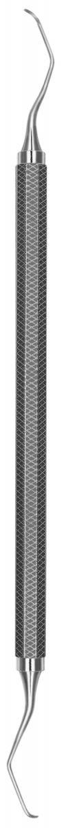 CURETTE GRACEY MINI-FIVE Facilita l'accesso a tasche gengivali profonde (più di 5 mm) grazie al gambo terminale allungato di 3 mm; anche l'accesso a ridotte superfici radicolari risulta facilitato grazie ad una punta più corta di quella della curette After-Five. L'effetto traumatico risulta ridotto, poichè la punta sottile permette di intervenire senza distendere il tessuto gengivale. Molto angolata, indicata per premolari e molari, mesiale. Manico nr.2, standard (Ø 6,5 mm).