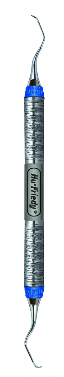 CURETTE GRACEY AFTER-FIVE Gambo terminale 3 mm più lungo per tasche gengivali profonde (almeno 5 mm). La sottile punta facilita l'accesso alle tasche preservando da un'eccessiva distensione del tessuto. Indicata sia per il deep scaling sia per la levigatura radicolare. Premolari/molari, distale. Manico nr.9, EverEdge Technology rotondo blu, più grosso (Ø 9,5 mm).