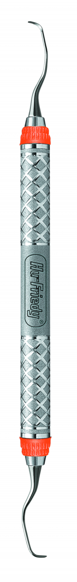 CURETTE GRACEY AFTER-FIVE Gambo terminale 3 mm più lungo per tasche gengivali profonde (almeno 5 mm). La sottile punta facilita l'accesso alle tasche preservando da un'eccessiva distensione del tessuto. Indicata sia per il deep scaling sia per la levigatura radicolare. Premolari/molari, mesiale. Manico nr.9, EverEdge Technology rotondo arancione, più grosso (Ø 9,5 mm).