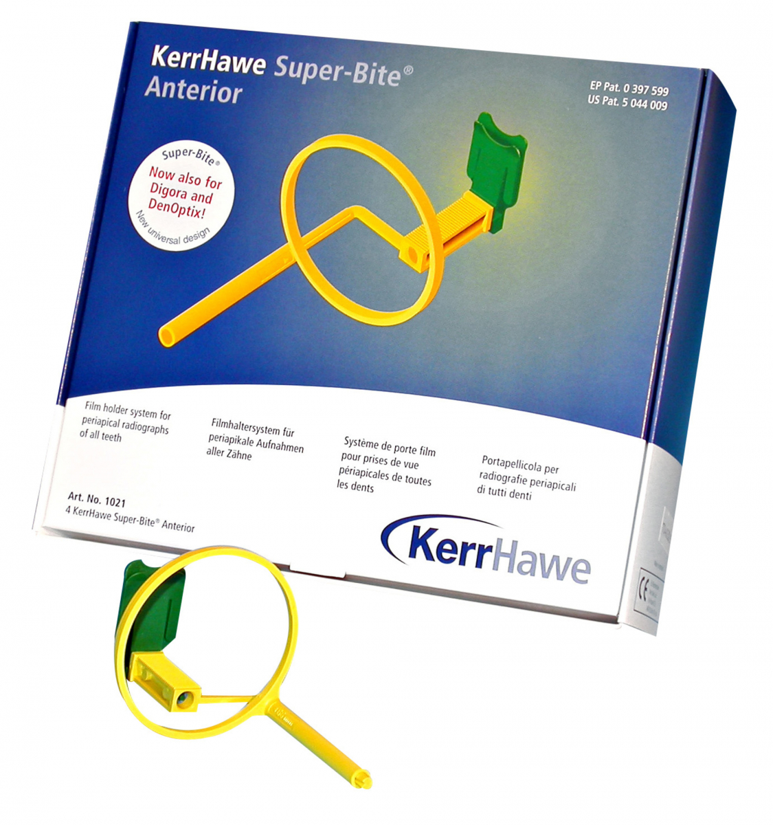 SUPER-BITE Portapellicola per radiografie periapicali. Centratura semplice grazie all'anello extraorale adatto a tutti i comuni tubi radiogeni, immagini fedeli e senza distorsioni. Disponibile in due modelli, Anterior e Posterior, per l'uso nei quattro quadranti. Sterilizzabile fino a 140°C. Confezione composta da: 4 Super-Bite Anterior con anello + 1 ausilio di centratura