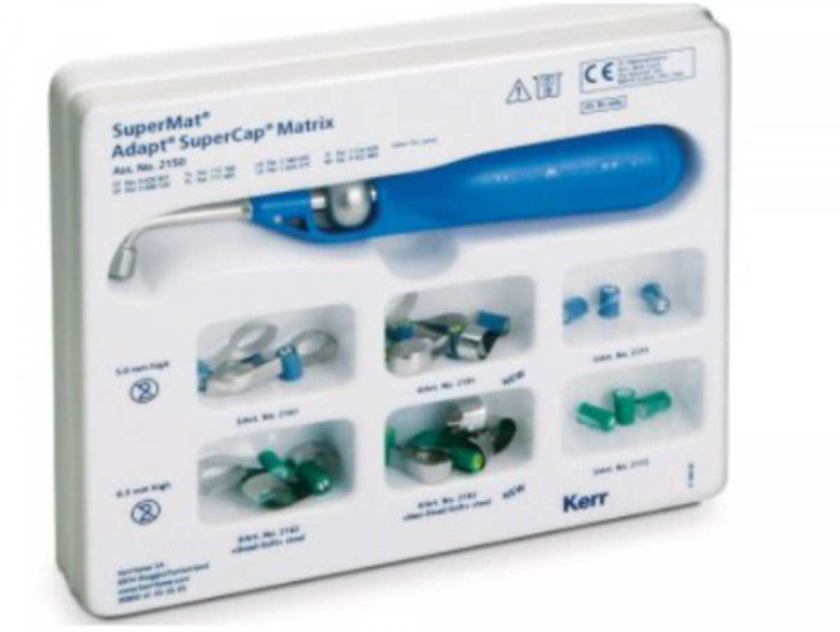SUPERMAT Le matrici SuperMat in combinazione con gli avvolgitori Adapt SuperCap costituiscono il sistema universale per posizionare matrici sui posteriori. Veloce e facile da utilizzare, è stato progettato per consentire la realizzazione di un perfetto restauro delle macro-cavità. Le matrici ad anello sono preformate in base agli standard internazionali di anatomia. Trasparenti e in acciaio sono adatte a premolari e molari e sono disponibili premontate sugli avvolgitori SuperCap. Per il fissaggio delle matrici SuperMat in cavità è necessario l'utilizzo dello strumento di fissaggio SuperLock. Assortimento: 1 strumento di fissaggio SuperLock + 14 matrici in acciaio Adapt SuperCap assortite + 6 matrici trasparenti Adapt SuperCap assortite