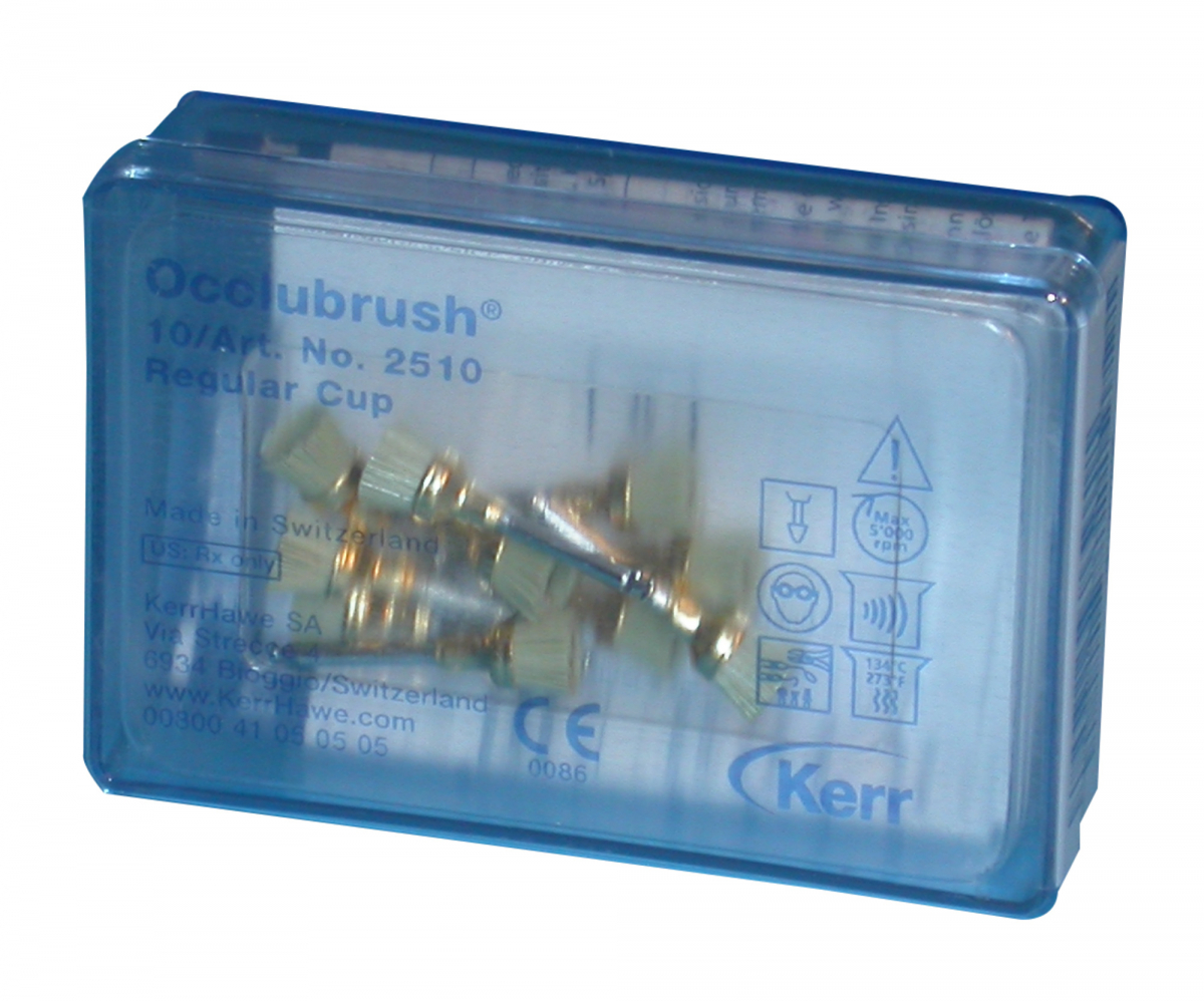 OCCLUBRUSH Coppette in setola, per la rifinitura e la lucidatura rapida. In fibra speciale, con agenti di brillantatura a base di carburo di silicio incorporati, questi spazzolini sono particolarmente indicati in presenza di restauri di superfici occlusali e concave in compomero, composito e cemento a base di fibra di vetro ceramica e resina. Si utilizzano senza l'impiego di paste e sono sterilizzabili fino a 140°C. Confezione da 10 pezzi - coppette regolari