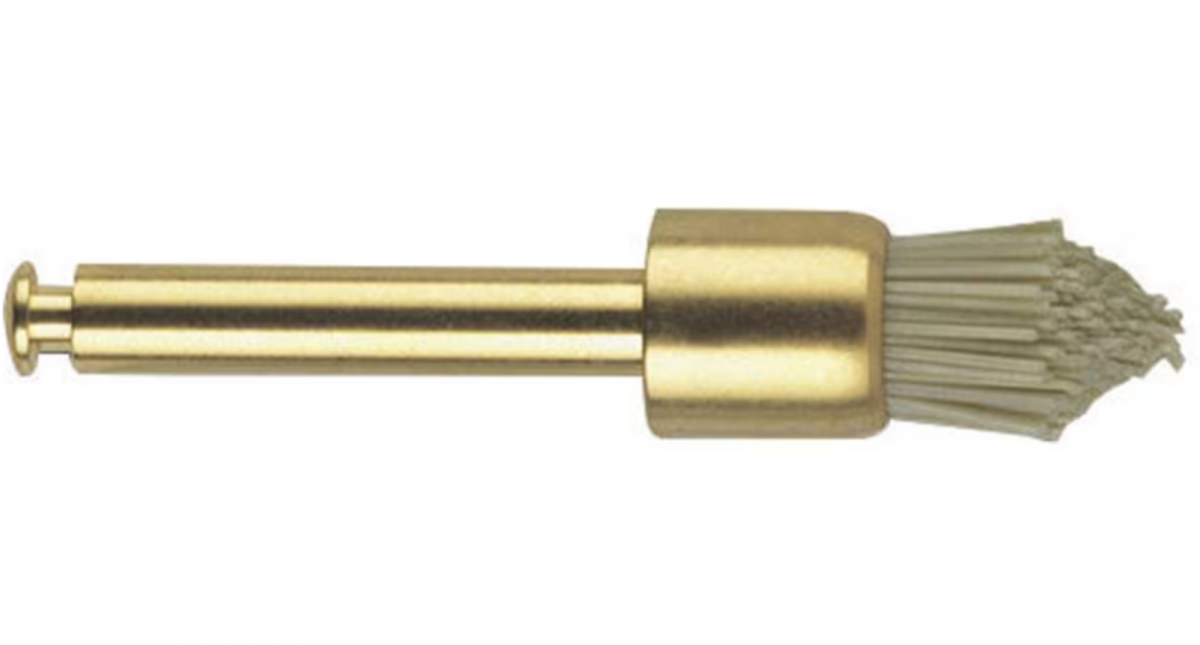 OCCLUBRUSH Coppette in setola, per la rifinitura e la lucidatura rapida. In fibra speciale, con agenti di brillantatura a base di carburo di silicio incorporati, questi spazzolini sono particolarmente indicati in presenza di restauri di superfici occlusali e concave in compomero, composito e cemento a base di fibra di vetro ceramica e resina. Si utilizzano senza l'impiego di paste e sono sterilizzabili fino a 140° C. Confezione da 10 pezzi - coppette a punta