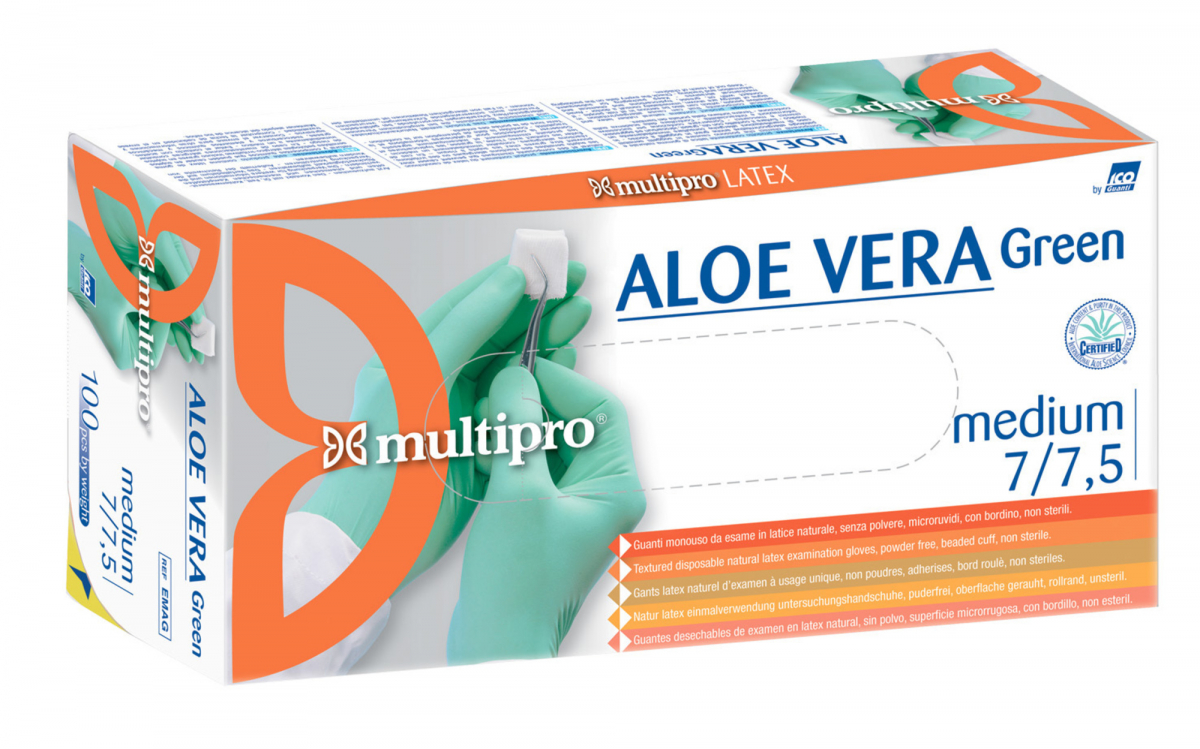 GUANTI MULTIPRO ALOE VERA Guanti medicali non sterili, in lattice di gomma naturale a ridottissimo contenuto proteico, senza polvere lubrificante: sottoposti a processo di alogenazione e successivo trattamento interno con gel di aloe vera "Active Aloe", che idrata ed ammorbidisce la pelle, riducendo gli effetti dell'uso frequente dei guanti. Dotati di bordino, con finitura interna opaca ed esterna microruvida. Monouso da esame, diagnostica, terapia, laboratorio: particolarmente indicati per uso intensivo.