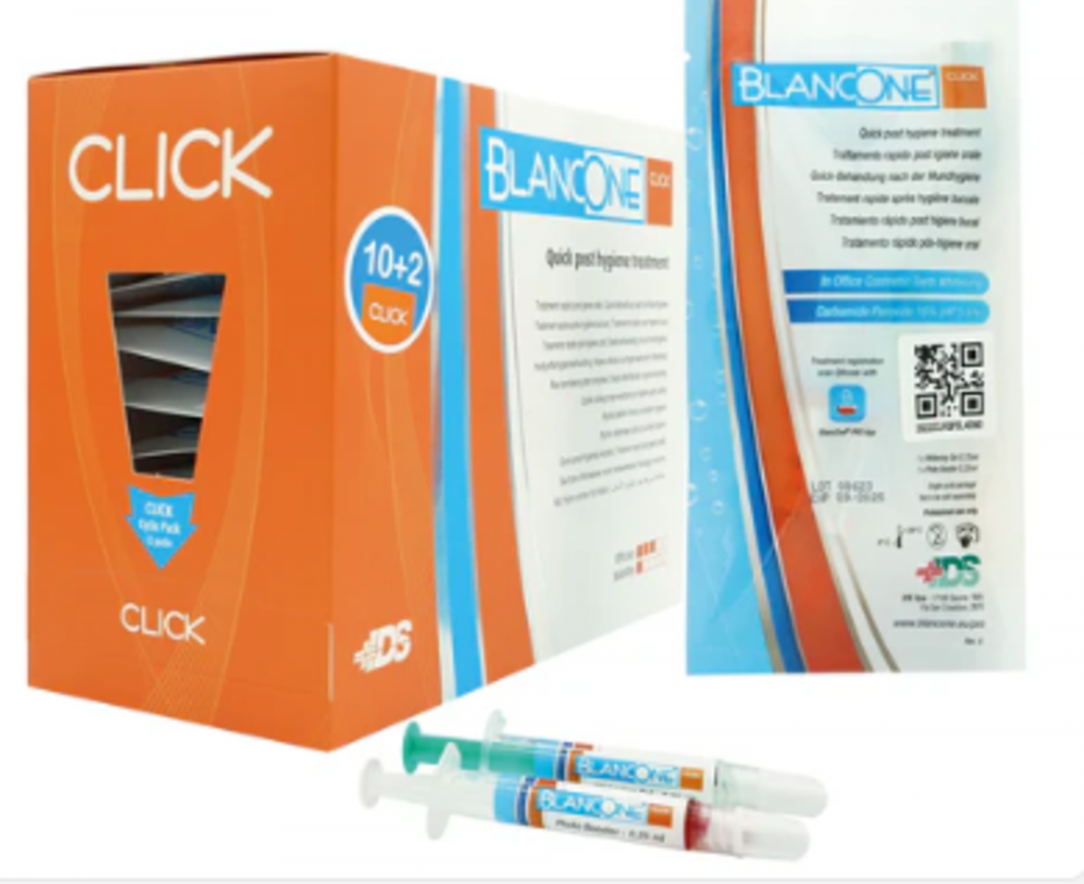 Trattamento sbiancante post igiene. Sbiancamento rapido foto attivato da eseguire in studio subito dopo l'igiene dentale. Questo trattamento cosmetico offre, ad un costo molto contenuto ed in soli 10 minuti, un richiestissimo upgrade alla seduta d'igiene dentale. BlancOne Click è stato pensato sia per promuovere un trattamento sbiancante completo (Touch o Ultra). BlancOne Click è a base di perossido di carbamide (perossido d'idrogeno rilasciato 6%). Ogni trattamento individuale contiene: Siringa perossido (0,75ml), Siringa Attivatore (0,25ml), raccordo, puntale, QR code per registrazione con App BlancOne