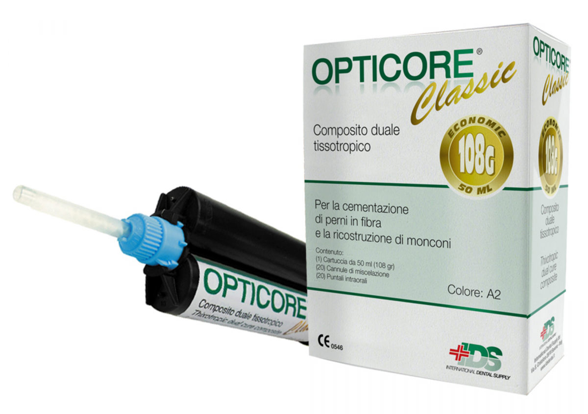 OPTICORE Materiale composito ad indurimento duale, ad alta resistenza, per la cementazione di perni endocanalari in fibra e per la ricostruzione di monconi. Caratterizzato da viraggio cromatico in fase di fotopolimerizzazione. VERSIONE PER DISPENSER D2 Consente di miscelare automaticamente il materiale e di applicarlo direttamente senza applicatore. Kit Intro: 1 cartuccia da 50 ml + 20 puntali + 20 oral tips