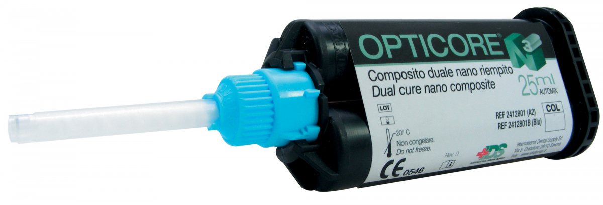 OPTICORE N3 Composito duale nano riempito di 3ª generazione per la cementazione di perni in fibra e la ricostruzione di monconi. Opticore N3 rappresenta la nano tecnologia all'ennesima potenza: la sua esclusiva formulazione a base di nano particelle di silicio, di biossido di zirconio e di fluoruro di calcio lo rende un prodotto dalle caratteristiche eccezionali. Superiori proprietà fisiche e meccaniche (minima contrazione, maggiore fluidità e migliore fresabilità rispetto all'Opticore classico), massima radiopacità ed ottima traslucenza, massima rimineralizzazione grazie ad una reattività 100 volte superiore. Applicazione facile, veloce e priva di bolle grazie ai pratici puntali Endo Tip. Confezione: 1 cartuccia da 25 ml + 10 puntali miscelatori + 10 puntali intraorali + 10 Endo Tip