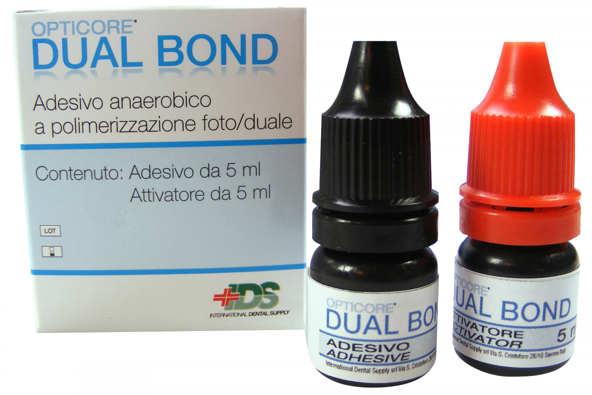 OPTICORE DUAL BOND Adesivo smalto/dentinale, ad indurimento duale, specifico per la cementazione dei perni endodontici, particolarmente indicato in campo umido. Eccezionalmente fluido, grazie alla formulazione a base di etanolo, penetra facilmente in profondità: inoltre la polimerizzazione avviene solamente in assenza di ossigeno, così che indurisce nel tubulo con il composito stesso, creando un'ottima adesione tra dente e restauro. Confezione: 1 flacone di adesivo da 5 ml + 1 flacone di catalizzatore da 5 ml