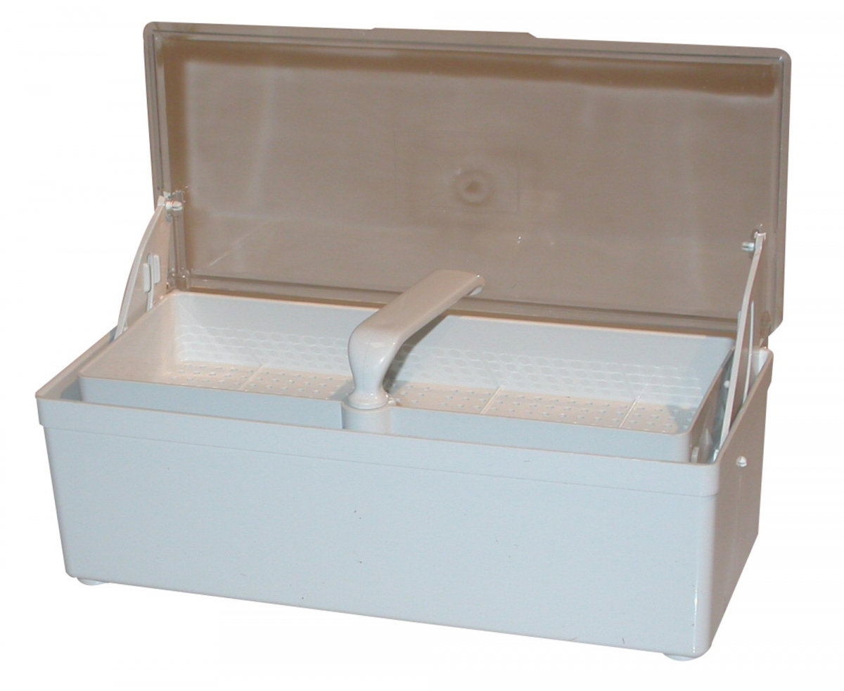 Vaschetta per sterilizzazione e disinfezione dello strumentario. Dimensioni: 26,5x8,5x11,3 cm (LxHxP) Confezione: 1 pezzo