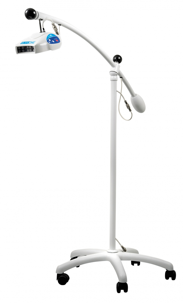 La lampada sbiancante a ARCUS BLEACHING SYSTEM è progettata per lo sbiancamento dei tessuti duri dentali mediante attivazione di un gel sbiancante utilizzato nella pratica odontoiatrica. Il dispositivo consiste di testa sbiancante e stativo. ARCUS BLEACHING SYSTEM è prodotta in conformità alla Direttiva CEE 93/42 sui dispositivi medici. _ _ _Le lampade sbiancanti ARCUS costituiscono una valida alternativa all’uso della lampada polimerizzatrice per attivare BlancOne. In soli 3 minuti e senza operatore, il gel sbiancante viene attivato su entrambe le arcate sprigionando il suo potere sbiancante. DATI TECNICI E DOTAZIONE: Testa ad emissione luminosa (600 mW/cm2); Base a 5 razze; Supporto verticale; Braccio orizzontale con contrappeso; 2 occhiali protettivi;