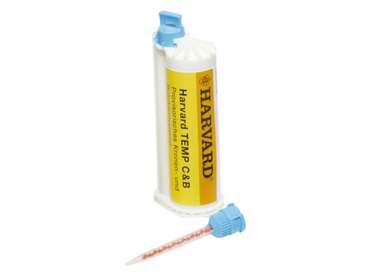 HARVARD TEMP C&B Materiale composito altamente estetico per la realizzazione di corone e ponti provvisori. Caratterizzato da un'alta resistenza alla rottura ed elevata durezza soprattutto per le faccette, vanta una ridotta contrazione durante la polimerizzazione ed un'elevata resistenza all'abrasione senza scolorimento. Delicato sulla polpa, senza metilmetacrilato, richiede una temperatura di polimerizzazione molto bassa: la fluorescenza naturale conferisce un aspetto simile a un dente reale. Confezione: cartuccia 10:1 da 50 ml (colore A3) + 10 puntali