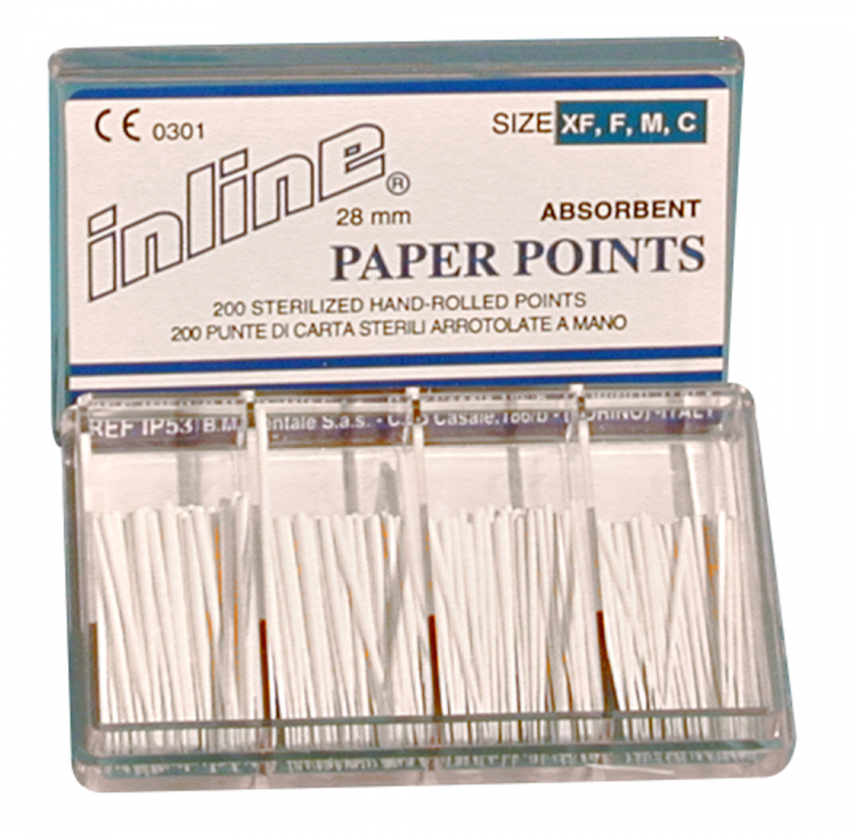 CONI CARTA Punte di carta normalizzate, per l'asciugatura dei canali radicolari. Lunghezza 28 mm. Confezione: 200 pezzi, in scomparti