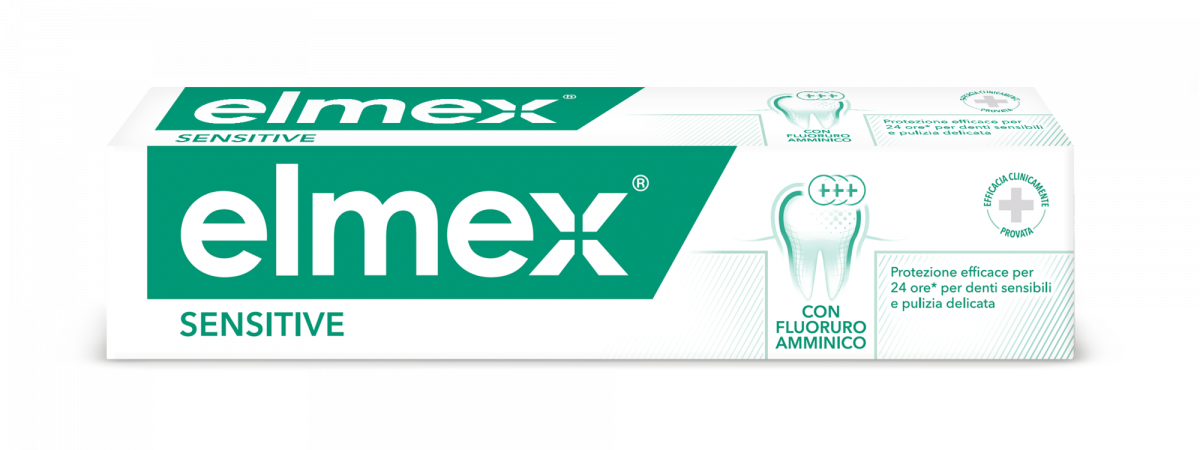 Il dentifricio elmex® SENSITIVE è clinicamente testato per fornire un sollievo duraturo e una pulizia delicata dei denti sensibili. L'efficacia del fluoruro amminico è stata dimostrata in numerosi studi clinici. Promuove la formazione di uno strato protettivo a lunga termine lungo il colletto dentale esposto, prevenendo così la sensibilità dentinale e la carie cervicale. Contiene esclusive particelle di silice per occludere i tubuli dentinali aperti per una migliore protezione della sensibilità.
