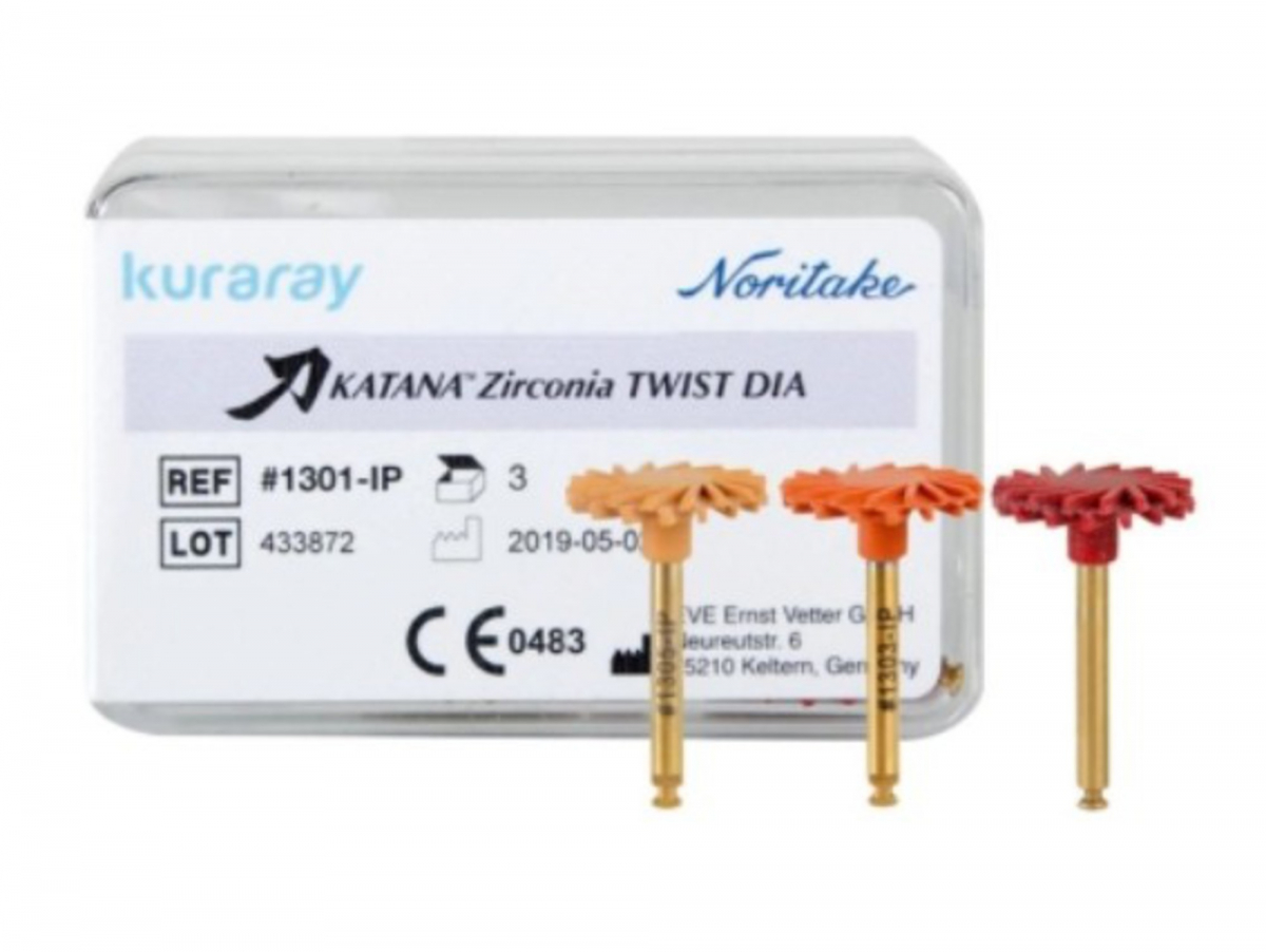 Dischi o strumenti di finitura / lucidatura su zirconia con struttura a spirale (TWIST), progettati per operazioni come lucidatura finale o intermedia della superficie delle protesi in zirconia.
