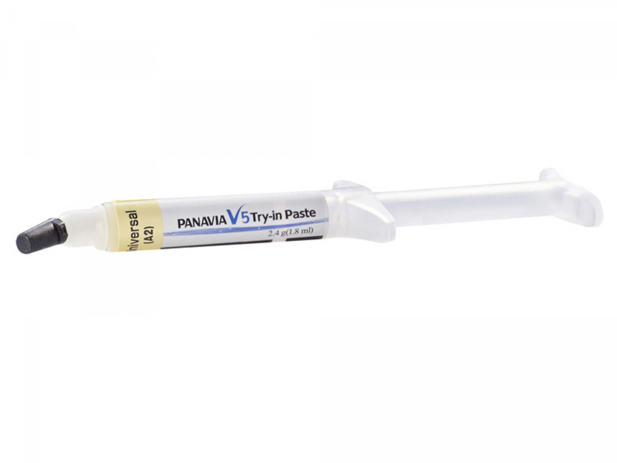 PANAVIA V5 Cemento resina definitivo, a polimerizzazione duale, a rilascio di fluoro, per un'ampia gamma di indicazioni cliniche: per restauri protesici su impianti, per cementazione di corone, ponti, inlay, onlay, faccette, ponti adesivi, splint, perni in fibra e fusi su monconi pre- protesici e amalgama. Per il pre- trattamento delle superfici protesiche si utilizza Clearfil Ceramic Primer Plus, il nuovo primer universale che permette di ottenere una superficie adesiva eccellente per tutte le ceramiche integrali (ceramiche, ceramiche ibride, disilicato di litio, zirconia e allumina), per compositi e metalli. Per trattare la superficie del dente, invece, è stato sviluppato il nuovo primer adesivo Tooth Primer che contiene un innovativo iniziatore di polimerizzazione e il monomero 10-MDP in un unico flacone. Tooth Primer permette di ottenere un'eccellente adesione alla struttura del dente con una procedura più semplice. Siringa Try-in Paste da 1,8 ml