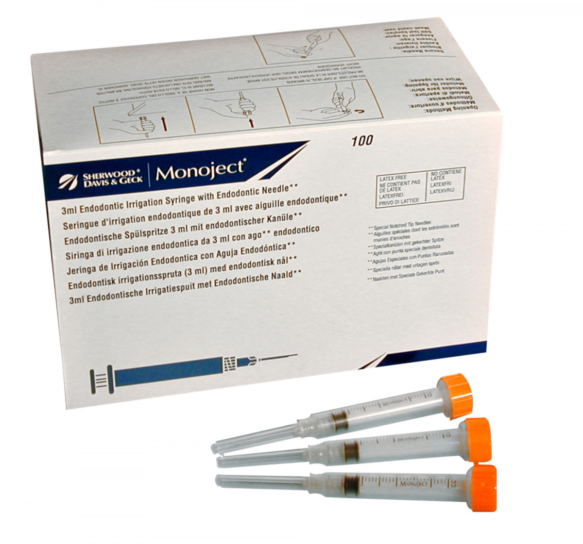 Siringa monouso, in polipropilene opaco, per lavaggi canalari. Provvista di ago ed attacco luer look: distribuita in confezione singola, sigillata, che ne assicura la sterilità. Siringa da 3 CC, ago da 27 G. Confezione da 100 siringhe