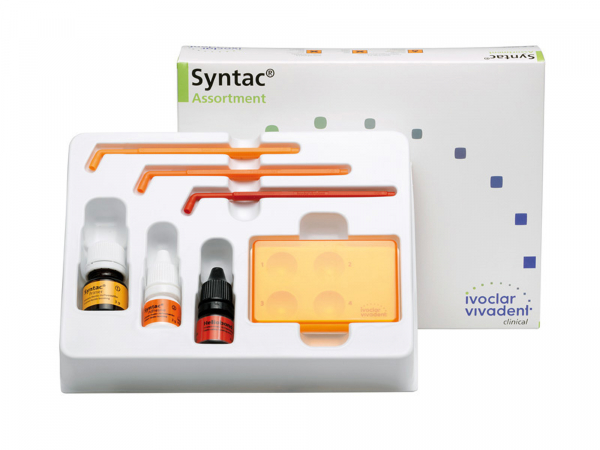 SYNTAC Adesivo bi-componente, fotopolimerizzabile, per restauri diretti ed indiretti. Minipack: Primer flaconcino da 3 gr + Adhesive flaconcino da 3 gr + Heliobond flaconcino da 6 gr + accessori