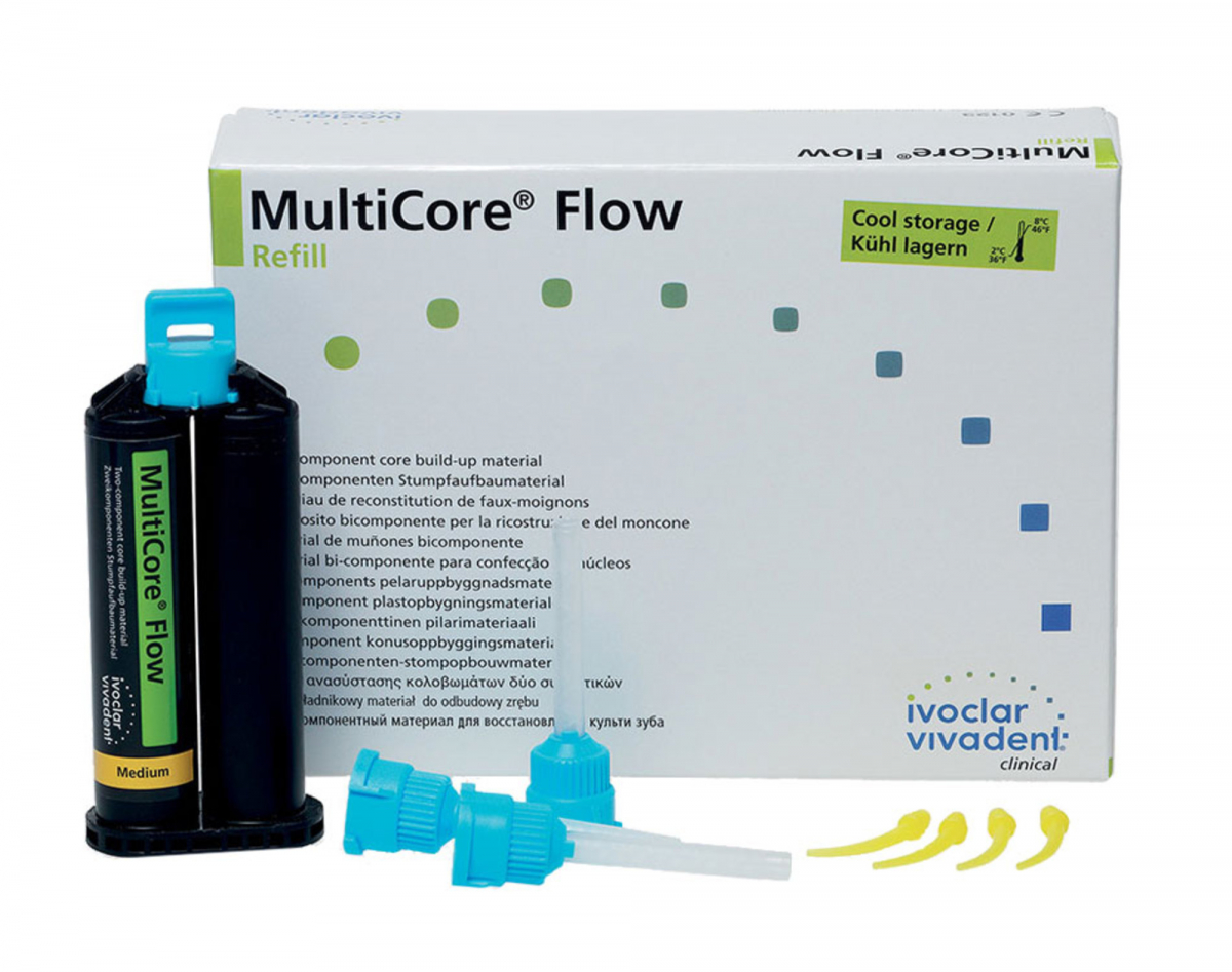 MULTICORE FLOW Composito autoindurente, ad alto scorrimento, per ricostruzioni dirette di monconi, con fotopolimerizzazione facoltativa. Ideale per la ricostruzione con tecnica a matrice. Confezione Ricambio: 1 cartuccia da 50 gr + 20 cannule di miscelazione + 20 beccucci intraorali + accessori