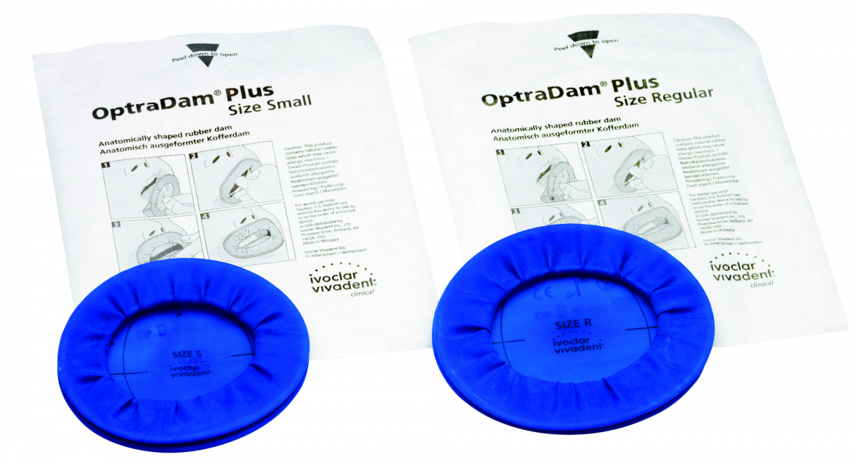 OPTRADAM PLUS Diga di forma anatomica che non necessita dell'impiego di uncini metallici. Questa nuova versione, in puro lattice di gomma più elastico, con anelli in plastica più flessibili e nuovo design di perforazione vanta i seguenti vantaggi: facilita e semplifica l'isolamento del dente e favorisce l'inserimento nella bocca del paziente. Confezione Ricambio: 50 dighe assortite (25 small + 25 regular)