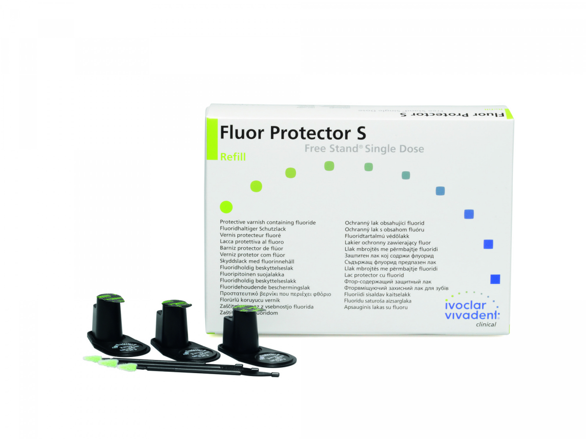 FLUOR PROTECTOR S Lacca dentale al fluoro, indicata per la sua azione desensibilizzante nonchè per la prevenzione di carie ed erosione dentale. Fluor Protector S si differenzia dall'attuale Fluor Protector per la sua innovativa formulazione, il gusto delicato e il confezionamento; inoltre è compatibile con i prodotti sbiancanti. La lacca pronta all'uso contiene 7700 ppm di fluoro in una soluzione omogenea (concentrazione ca. 4 volte maggiore una volta asciutta), è di gusto e profumo gradevoli, presenta eccellenti proprietà di scorrimento e umettamento ed è relativamente tollerante all'umidità durante l'applicazione. Fluor Protector S si presenta in due formati: nell'economico tubo e in singole confezioni monodose. Viene applicato professionalmente dal dentista, in studio o in condizioni pratiche (sul campo). Confezione: 20 Single Dose da 0,26 gr cad. + accessori