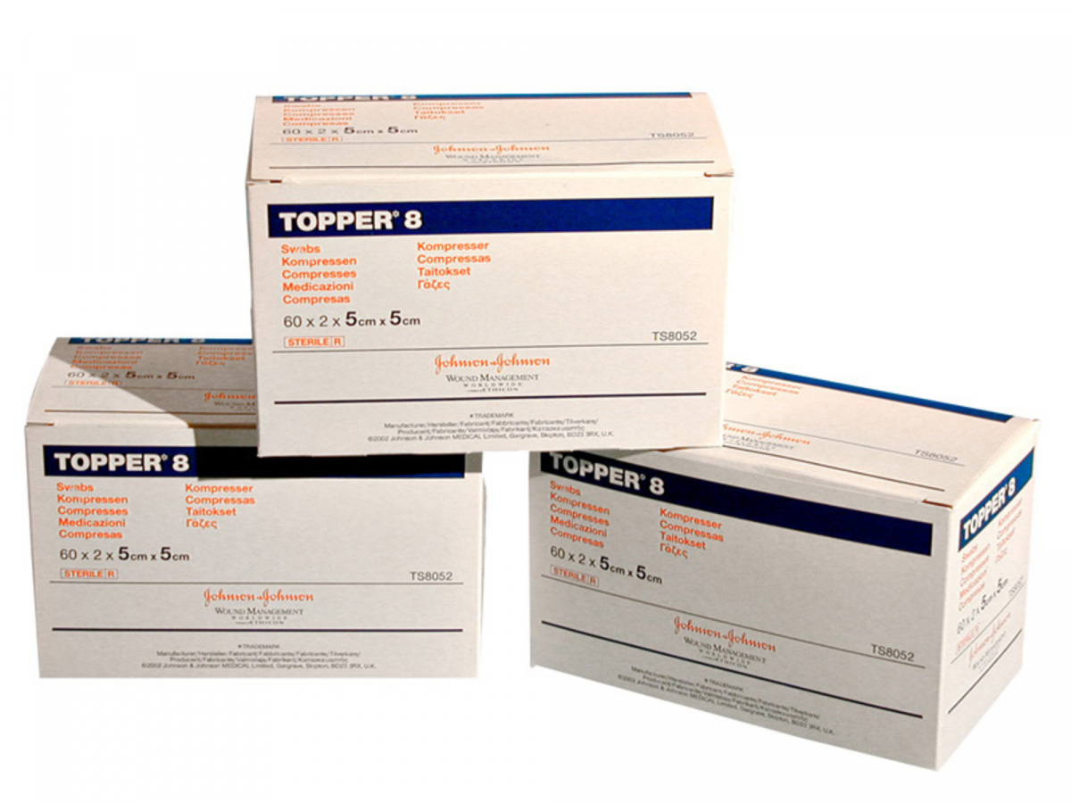 COMPRESSE IN TNT TOPPER 8 Garze sterili a 4 strati, ad elevata capacità di assorbimento, in TNT. Biodegradabili. Misura 5x5 cm. Box da 60 buste da 2 garze cad.