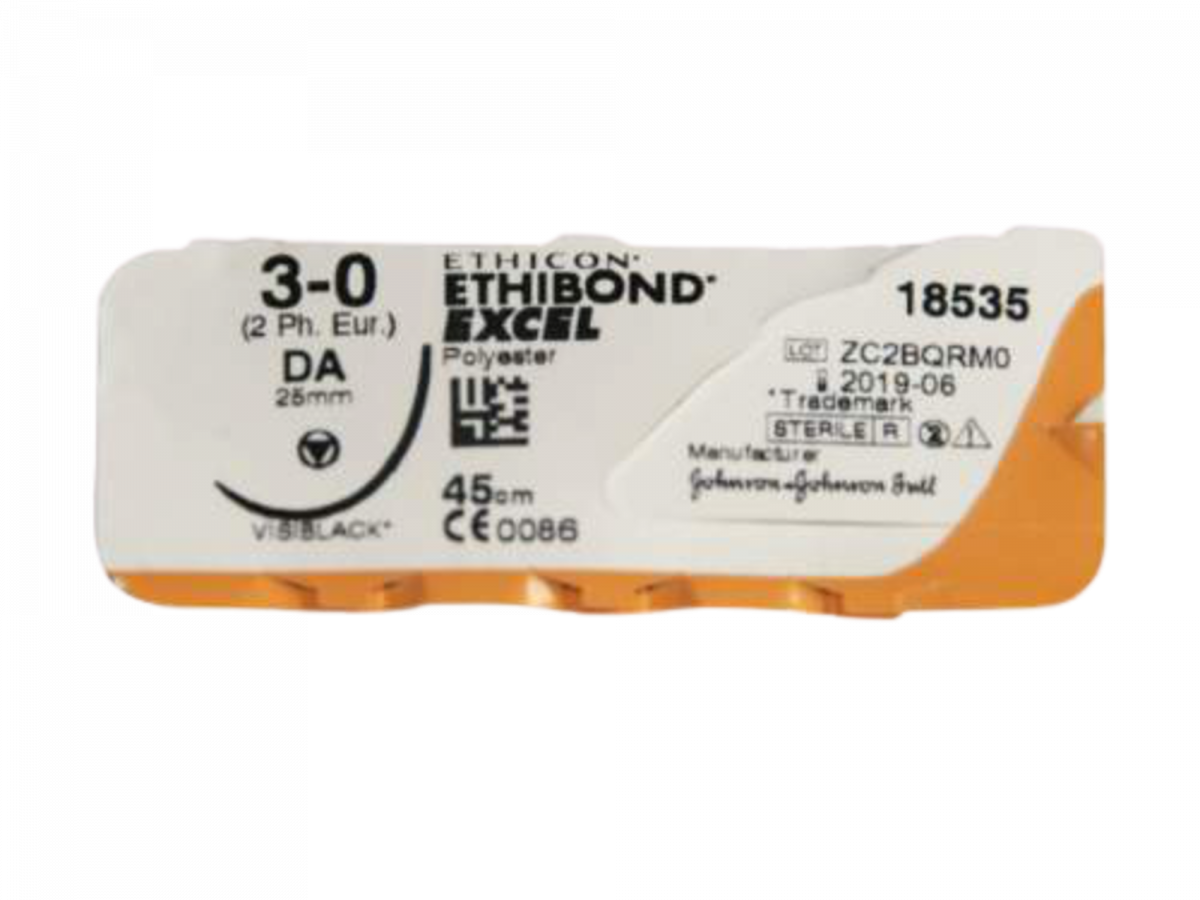 SUTURE ETHIBOND EXCEL Sutura sintetica (poliestere) intrecciata, non assorbibile, di colore verde. Rivestita di polibutilato, è morbida, compatta, maneggevole ed ha minima reazione tissutale.