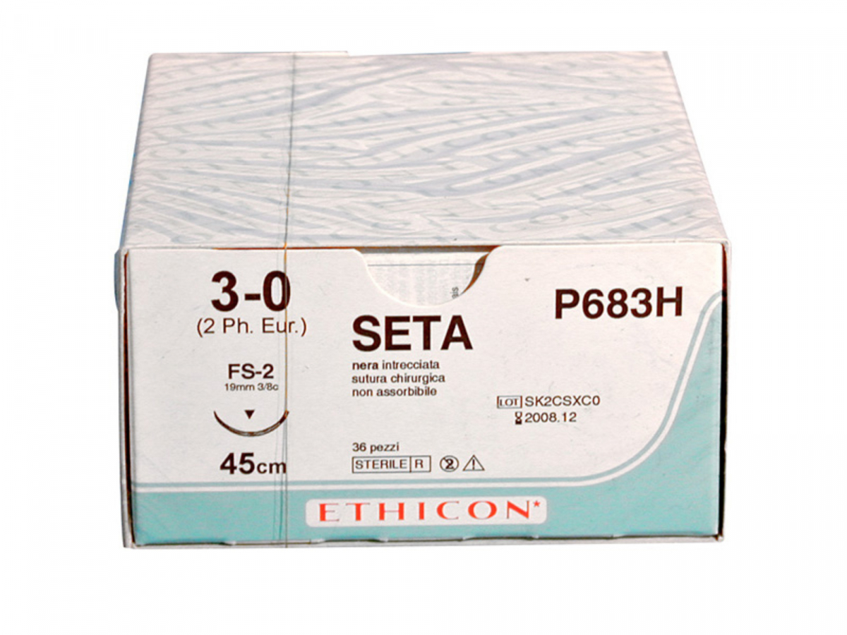 SUTURE SETA ,Sutura in fibra proteica naturale ricavata dal baco, intrecciata, non assorbibile, di colore nero. Rivestita di cera d'api, affidabile dal punto di vista della biocompatibilità e della non capillarità.AGO DORSO TAGLIENTE FS-2 filo 45 cm.3/0 conf.36pz.
