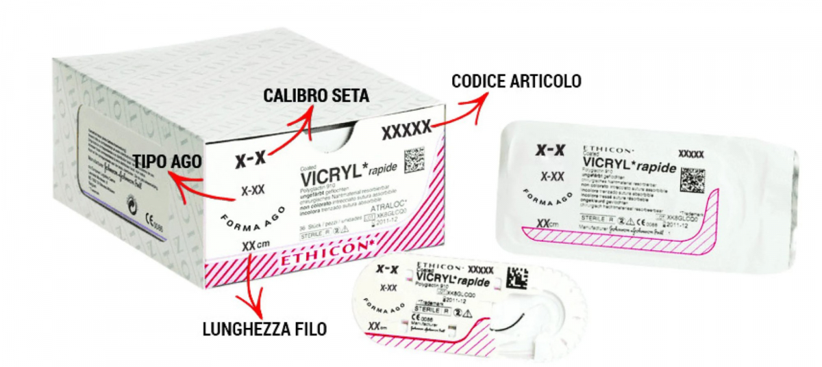 Realizzato con copolimero di acido glicolico ed acido lattico (Polyglactin 910) trattato con radiazioni ionizzanti, rivestito con Polyglactin 370 e stearato di calcio, epsilon-caprolattone e acido glicolico.