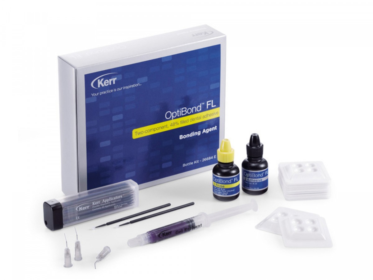 OPTIBOND FL Adesivo smalto-dentinale multicomponente, a tecnica di mordenzatura totale. FL, Filled and Light Cured (Adesivo riempito fotopolimerizzabile): tale sistema svolge il compito sia di adesivo che di liner di cavità. Riempito al 48% con vetro di silice, garantisce un'adesione strutturale; semplice da usare, non si miscela ed è sufficiente un'unica fotopolimerizzazione. Kit: 1 flacone da 8 ml OptiBond FL Primer + 1 flacone da 8 ml OptiBond FL Adhesive + 1 siringa da 3 gr di Gel Etchant + 10 puntali monouso per siringhe Gel Etchant + 25 pozzetti per miscelazione + 50 applicatori monouso