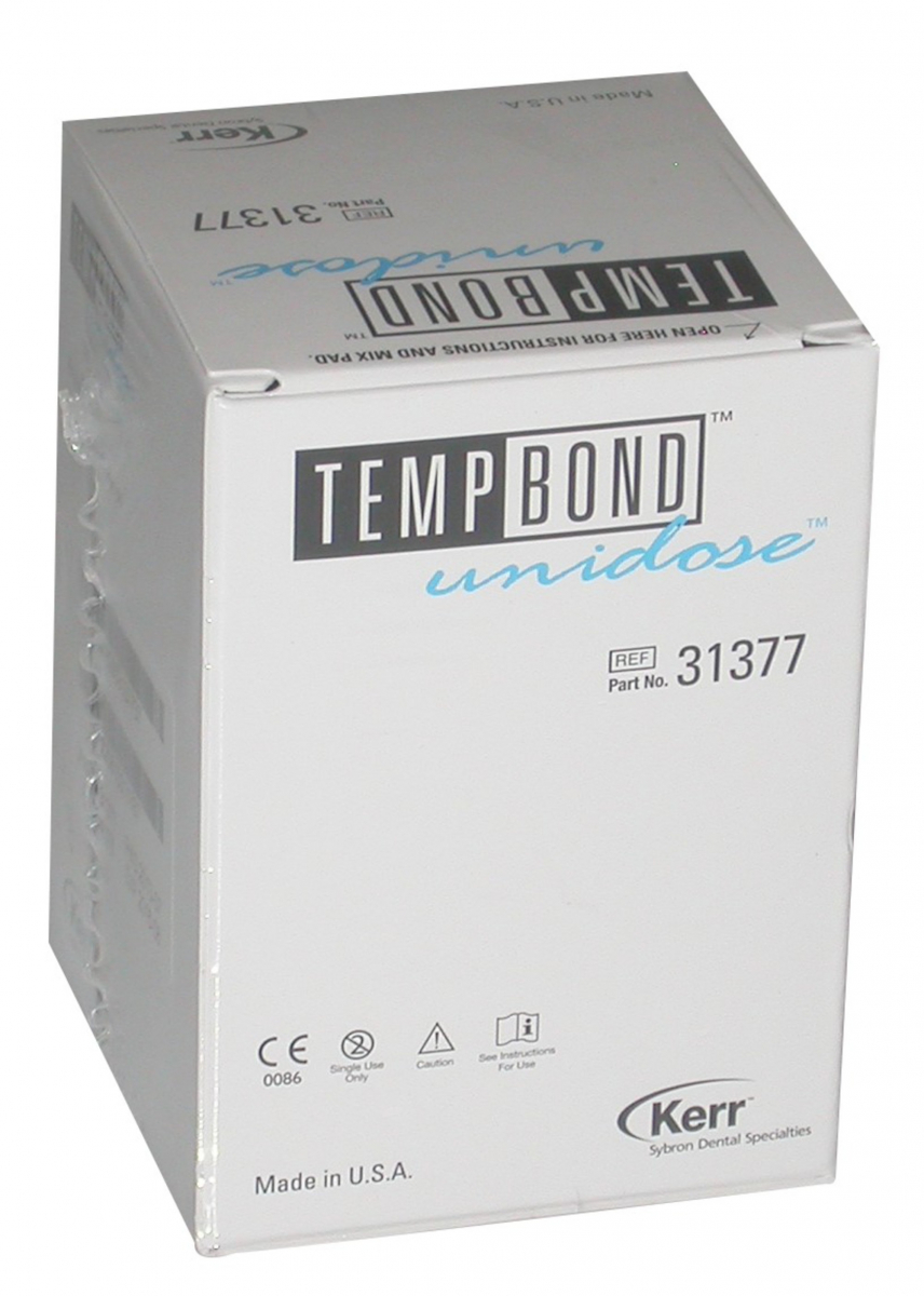 TEMPBOND UNIDOSE Cemento provvisorio autoindurente, a base di ossido di zinco-eugenolo, per corone e ponti provvisori. La sua morbidezza lo rende adattabile senza sforzo. In bustine monodose, pronte all'uso, ideali da lasciare al paziente per situazioni di emergenza. Confezione: 50 bustine Unidose da 2,4 gr cad.