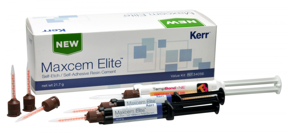 MAXCEM ELITE Cemento resinoso automordenzante e autoadesivo, a polimerizzazione duale (sia foto che autopolimerizzante), indicato per tutti i restauri indiretti. Aderisce a tutti i substrati senza l'impiego di alcun adesivo; estetico, fedele cromaticamente nel tempo. Sempre pronto all'uso, senza l'impiego di accessori opzionali; applicazione diretta tramite siringa automiscelante e nuovi beccucci intraorali e intracanalari, per un miglior posizionamento in situ. Facile rimozione delle eccedenze. Si conserva a temperatura ambiente. Value Kit: 2 siringhe da 5 gr cad. (colore Chiaro) + 1 siringa automix TempBond NE da 11,7 gr + 16 puntali automiscelanti (8 standard + 8 con attacco per beccucci intraorali e intracanalari) + 16 beccucci (8 intraorali + 8 automiscelanti per TempBond) + accessori