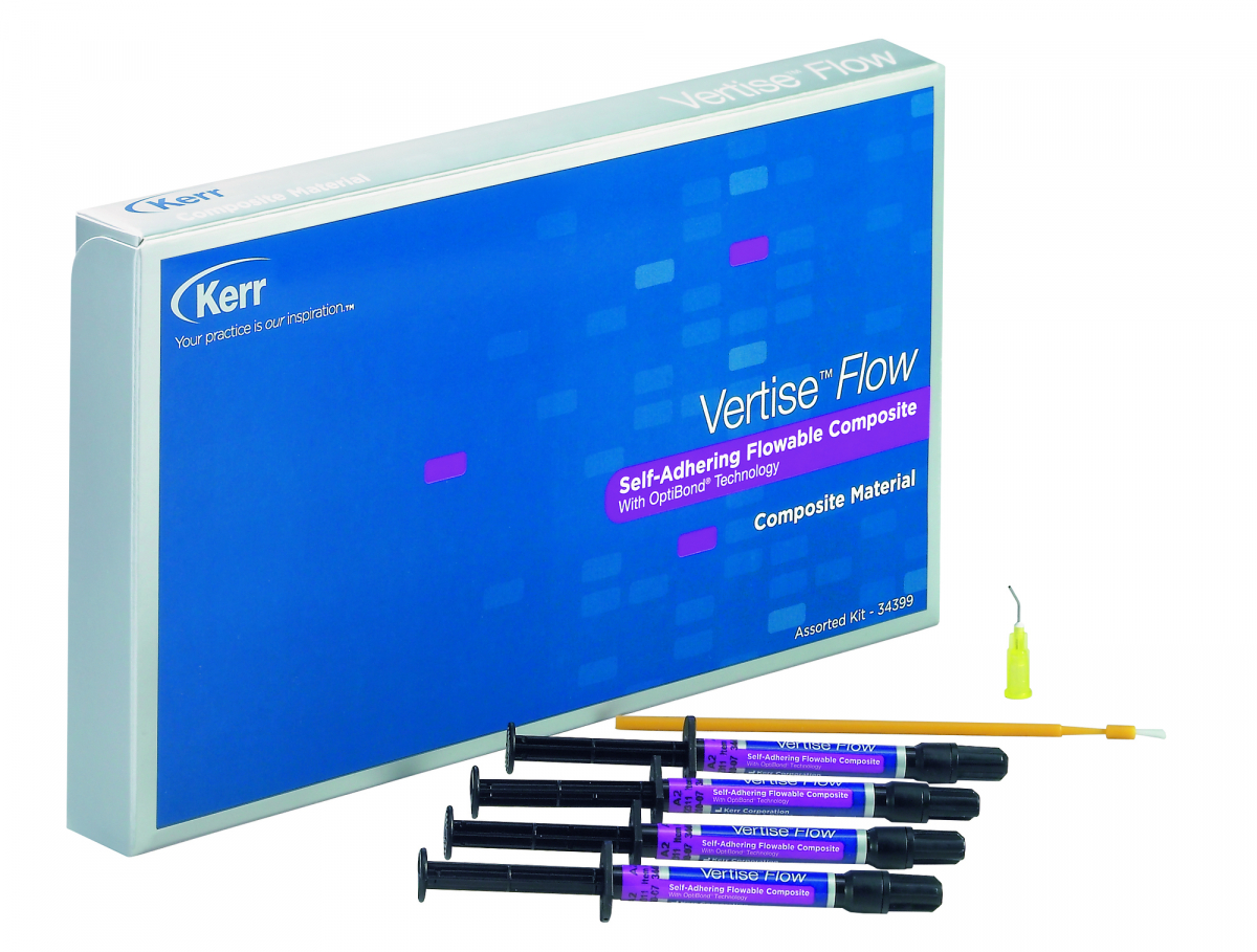 VERTISE FLOW Composito fluido autoadesivo, a base di resina fotopolimerizzabile per applicazioni dirette. Basato sulla comprovata tecnologia adesiva OptiBond, Vertise Flow elimina i passaggi aggiuntivi di mordenzatura/priming/adesione: automordenzante, ad elevata radiopacità, è indicato per piccoli restauri di classe I e come liner di cavità per restauri di classe I e II, sigillante di solchi e fessure, riparazione di difetti dello smalto, riparazione di restauri in porcellana, eliminazione di sottosquadri, piccole ricostruzioni occlusali in aree non sottoposte a carichi ed abrasioni incisali. Caratterizzato da un'elevata forza di adesione sulla dentina e sullo smalto, vanta un'eccezionale integrità del margine (ridotte microinfiltrazioni) ed eccellenti proprietà meccaniche. Dopo i trattamenti di lucidatura presenta delle caratteristiche di brillantezza simili a quelle dei compositi fluidi tradizionali. Kit Assortito: 4 siringhe da 2 gr cad. nei colori A2/A3/A3,5/Opaco universale + 40 puntali di applicazione