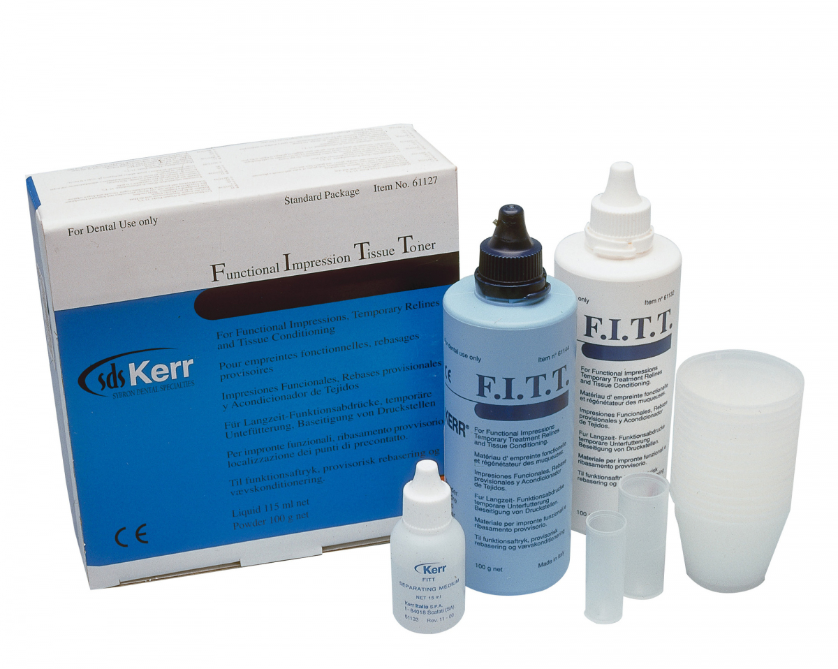 FITT Materiale siliconico per ribasature provvisorie, indicato anche come condizionatore tissutale e per impronte dinamico-funzionali. Confezione: polvere da 100 gr + liquido da 100 ml + accessori
