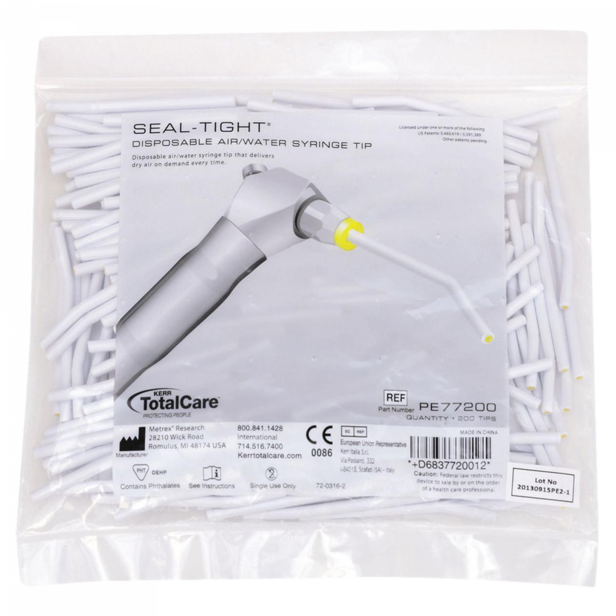SEAL-TIGHT - Kerr Puntali monouso per siringhe aria/acqua; assicurano un flusso costante di aria s ecca quando si passa dall'impiego dello spray a quello dell'aria. Il canale inte rno del puntale, di colore giallo, costi tuisce un vero O-Ring di tenuta che vien e sostituito ogni volta che si cambia il puntale stesso. I puntali possono esser e piegati fino a 90°. Busta dispenser: 200 puntali