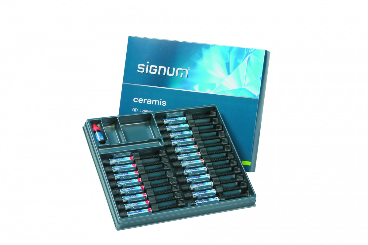 SIGNUM CERAMIS Composito con particelle di vetroceramica adatto specificatamente per la tecnica Metal Free. Combinabile con Signum Matrix. SIGNUM CERAMIS SET - Contenuto: 8x4 gr Signum ceramis dentine (colori DA2,DA3,DA3.5,DA4,DB2,DB3,DC3,DD3) + 3x4 gr Signum ceramis smalti (colori EL,EM,ED) + 5x4 gr Signum ceramis effect (colori ET1 transparent,ET2 transparent blue,ET4 transparent orange,ET5 transparent white,ET6 transparent clear) + 4x4 gr Signum ceramis margin (colori M1,M2,M3,M4) + 1x4 Signum liquido
