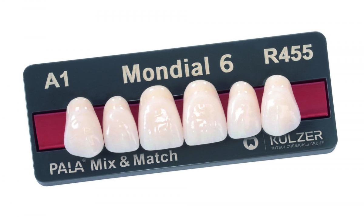 MONDIAL 6 Denti acrilici realizzati con Nanopearls, microfiller e nano particelle di nuova concezione, che conferiscono una resistenza all'abrasione superiore del 50% rispetto ai materiali in PMMA convenzionali; biocompatibili, resistenti alla placca, elevata stabilità del colore, migliorata adesione tra i vari strati (tecnica multiplayer tridimensionale). Inoltre sono realizzati con tecnologia CAD/CAM, che consente di realizzare denti identici tra loro grazie alla digitalizzazione bilaterale. Denti anteriori con estetica migliore grazie a nuove classificazioni: la loro stratificazione riprende la naturalezza del dente naturale. La modellazione marcata delle superfici labiali e i bordi dello smalto rilevati lateralmente contribuiscono a rendere vivace il gioco cromatico in qualsiasi condizione di luce. Il colletto del dente può essere sottoposto a invecchiamento variabile mediante ritocco, caratteristica che rende questi denti adatti a pazienti di tutte le età. Disponibili in 18 forme superiori e 10 forme inferiori.