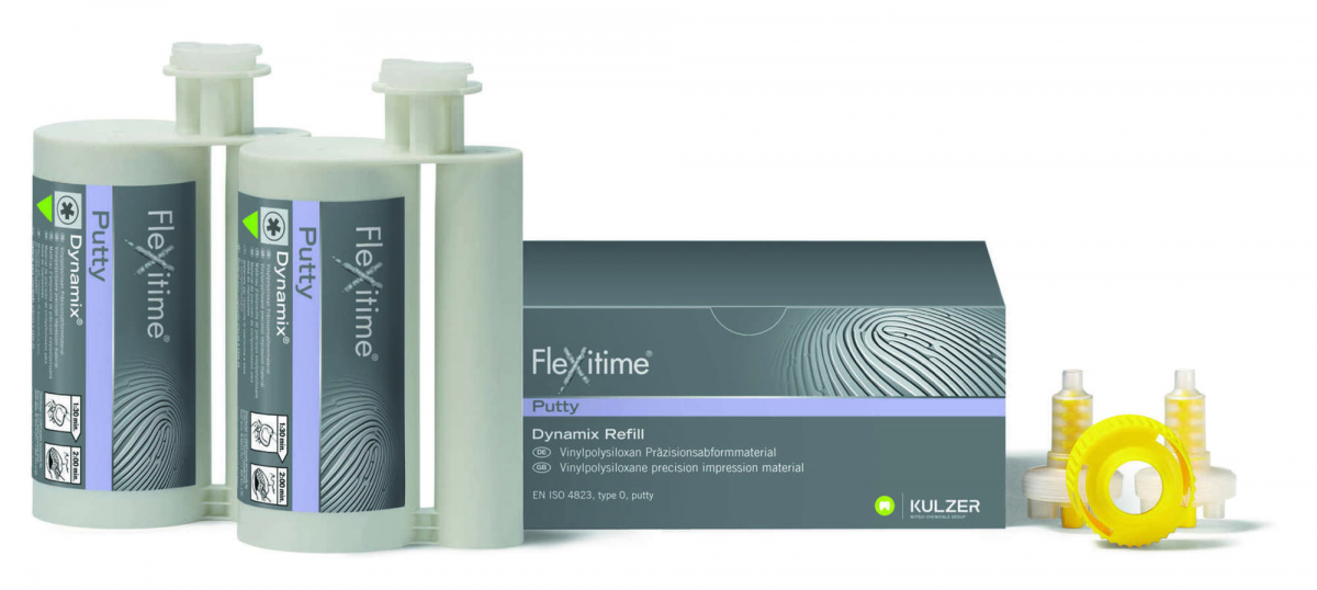 FLEXITIME CARTUCCE DYNAMIX Versione della gamma Flexitime in Cartuccia Dynamix 5:1 per miscelazione automatica negli appositi apparecchi automiscelanti (per es. Dynamix). Notevoli i vantaggi: - garanzia di una omogenea qualità di miscelazione - economicità, più volume e minor spreco di materiale - pronta all'uso, veloce e pratico utilizzo - realizzata in materiale riciclabile FLEXITIME DYNAMIX PUTTY Confezione: 2 cartucce da 380 ml cad. di Dynamix Putty + 2 puntali di miscelazione Dynamix + 1 anello di fissaggio Dynamix