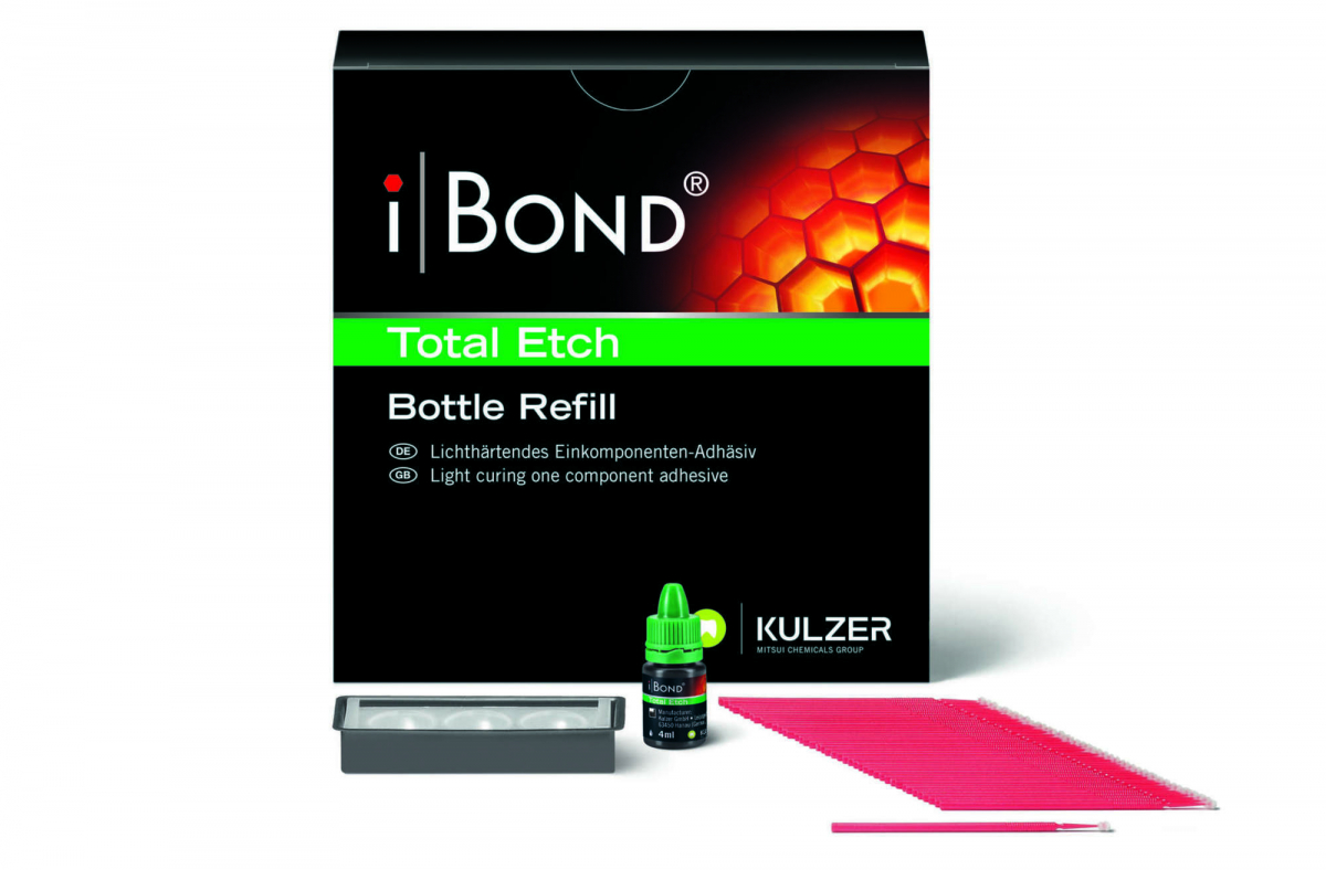 IBOND TOTAL ETCH Adesivo monocomponente "Etch&Rinse" di 5ª generazione, che, grazie all'innovativo sistema basato su nanofillers, non solo raggiunge un elevato valore di adesione su smalto e dentina, ma garantisce anche un ottimale adattamento marginale e risulta ideale nella desensibilizzazione delle aree ipersensibili. Inoltre l'applicazione del prodotto è molto semplice: dopo la mordenzatura e il risciacquo si applica 1 solo strato di adesivo e si aspettano solo 15 secondi prima di asciugare e fotopolimerizzare il prodotto. Ricambio Flacone: 1 flacone da 4 ml + 50 applicatori + vaschetta