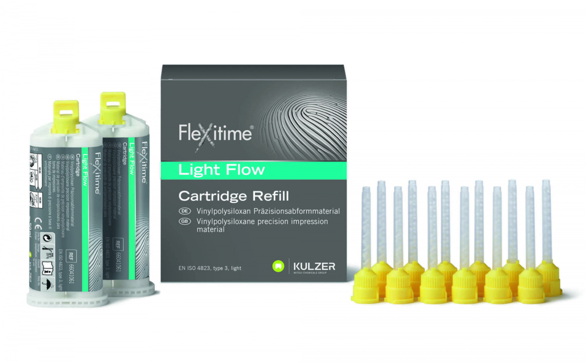 FLEXITIME Silicone di tipo A, idroattivo, a base di polivinilsilossano. La sua innovativa formula ATS (Advanced Therma Sense) determina un'accelerazione della reazione di polimerizzazione: questa fase infatti inizia non appena viene percepita la temperatura di 37°C del cavo orale e il prodotto indurisce in 2'30". Flexitime è disponibile da oggi in 6 consistenze per soddisfare meglio le esigenze di tutte le tecniche di rilevazione. Confezione Ricambio Light Flow: 2 cartucce da 50 ml cad. + 12 puntali di miscelazione gialli
