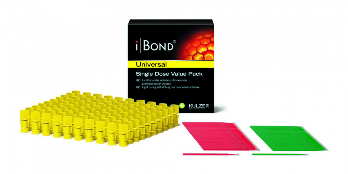 iBOND UNIVERSAL Adesivo universale,fotopolimerizzabile, adatto per ogni tecnica adesiva e per tutte le indicazioni cliniche; è considerato un all-rounder per la sua affidabile forza adesiva e la sua versatilità in tutte le situazioni. La sua formulazione unica ed innovativa, su base acetonica, facilita l'operazione di asciugatura, garantendo un'eccezionale controllo dell'umidità. Compatibile con tutti i materiali fotopolimerizzabili, autopolimerizzabili e duali senza la necessità di un attivatore. Single Dose Value Pack: 100 Singles doses + 50 applicatori verdi (sottili) + 50 applicatori rossi (regular)