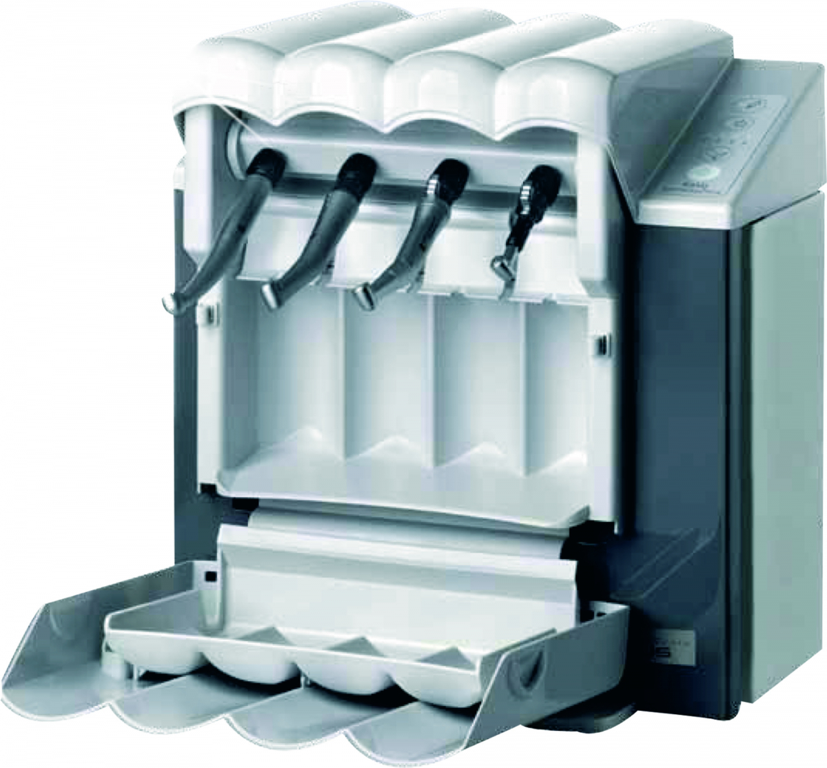 Dispositivo unico, per la pulizia e la corretta manutenzione di turbine, contrangoli, testine e push button, rapidamente e con estrema semplicità: con la pressione di un tasto, in modo automatico ed in un solo minuto viene effettuata la pulizia di quattro strumenti. Alla fine del ciclo è possibile utilizzare immediatamente gli strumenti. Caratteristiche principali: design moderno ed ergonomico, ciclo automatico comandato da programma, lubrificazione ottimale grazie al sistema di dosaggio automatico per i singoli attacchi, flusso di aria compressa nei condotti di trasmissione e dello spray con la funzione di spurgo, compatibilità universale (disponibili adattatori per i modelli più comuni presenti sul mercato). Nessuna fuoriuscita di residui di lubrificante dagli strumenti dopo la pulizia. QUATTROcare PLUS assicura una gestione semplice, che evita errori nella procedura di manutenzione: migliora la rotazione degli strumenti, ed allunga la loro durata. Non necessita di manutenzione. Dimensioni: