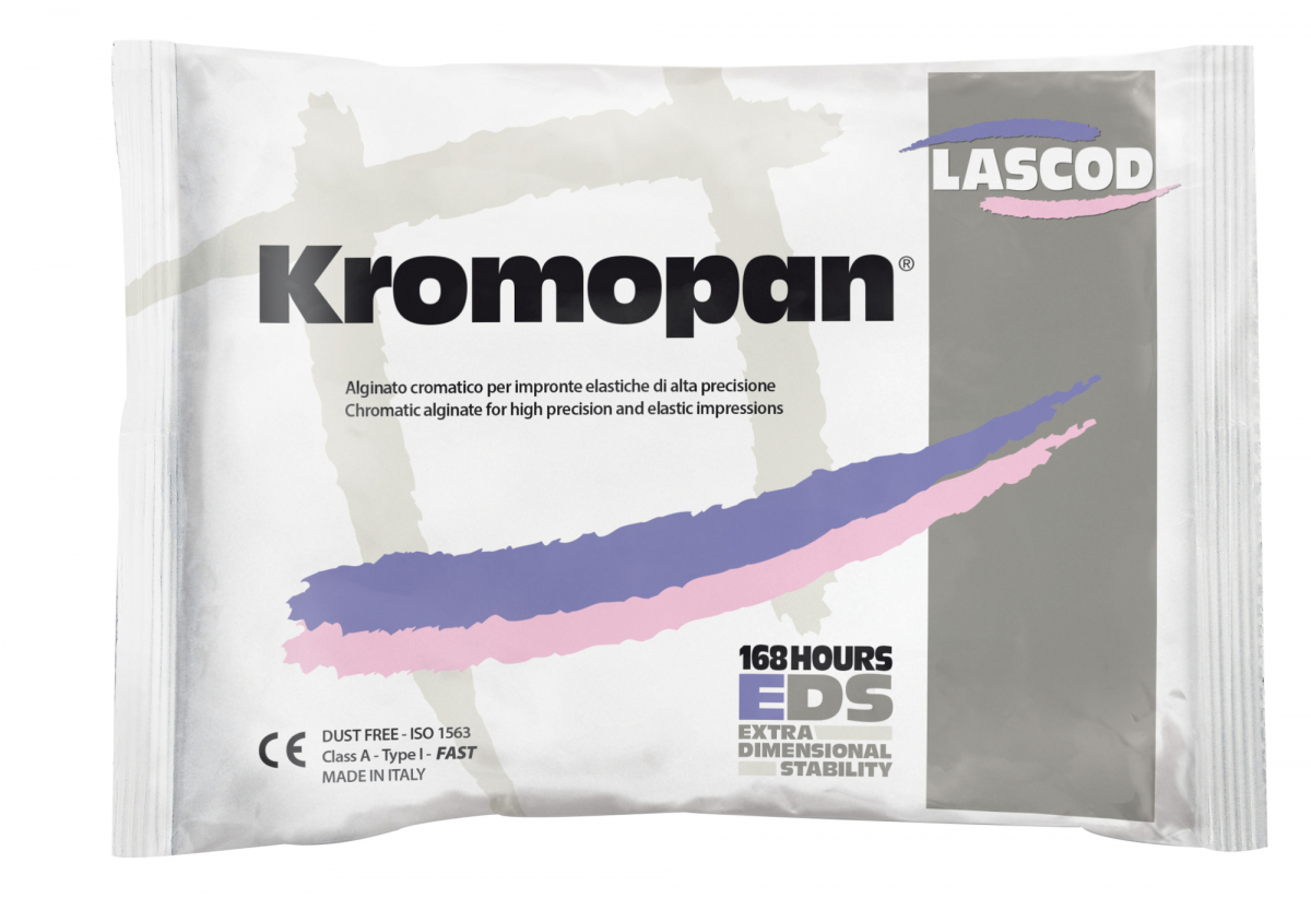 KROMOPAN Alginato a presa rapida, a viraggio cromatico. Indicato per impronte di precisione, non sviluppa polvere durante la miscelazione. Busta da 450 gr.